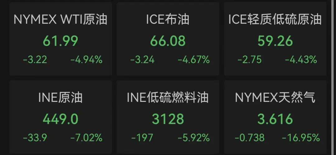 油气板块亦迎来暴击。国内原油、燃油期货主力合约跌停,跌幅均约为7%。布伦特原油期货向下触及66美元/桶,日内跌4.67%。WTI原油期货失守62美元/桶,日内跌4.94%。