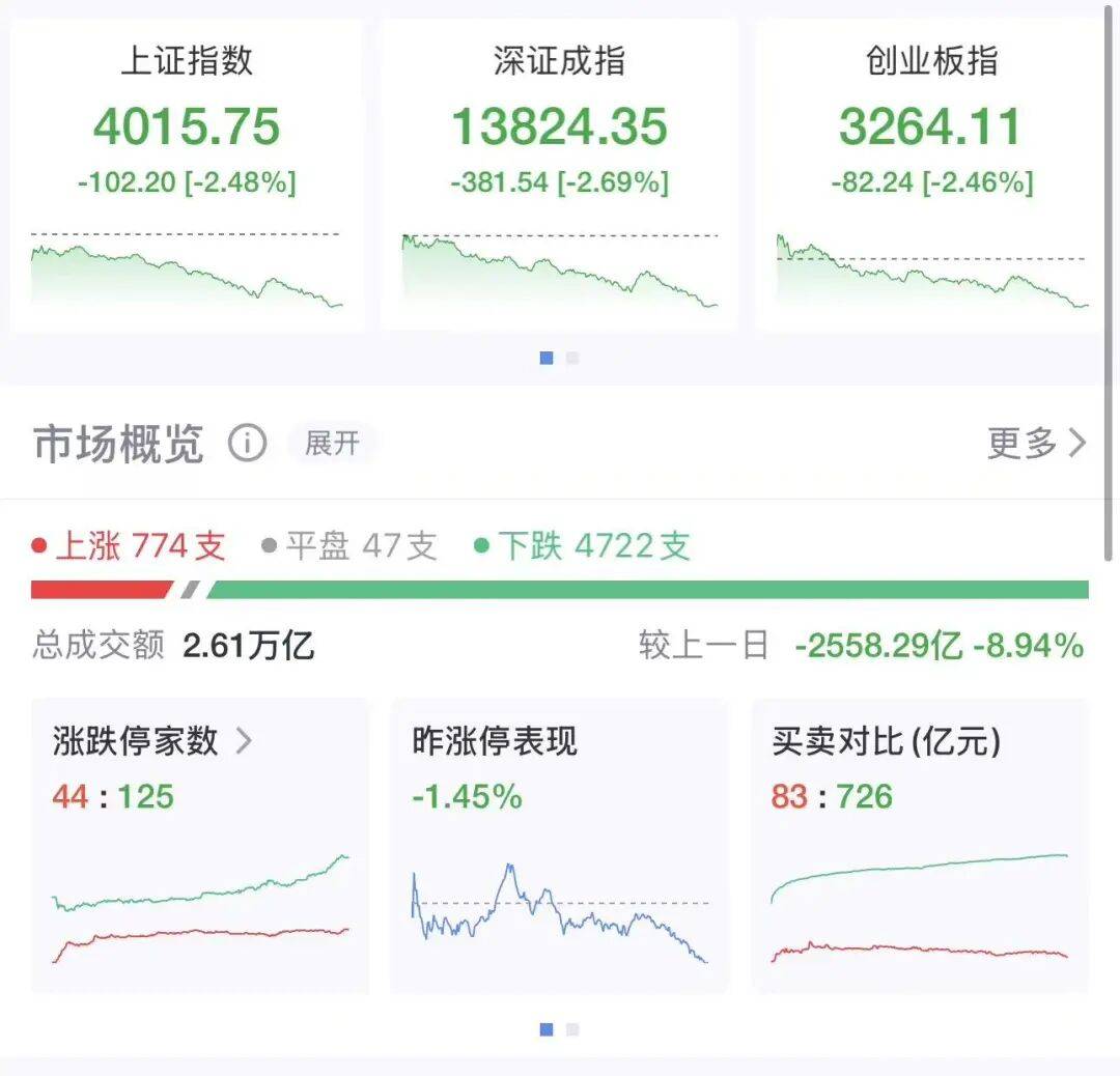 2月2日收盘,市场全天震荡调整,三大指数均跌超2%,科创50指数跌超3%。截至收盘,沪指跌2.48%,深成指跌2.69%,创业板指跌2.46%。A股成交额2.61万亿元,较上一个交易日缩量2558.29亿元。盘面上,全市场超4700只个股下跌,其中125只个股跌停。