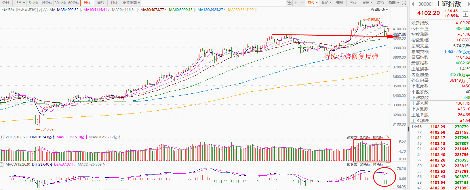 上证指数今日震荡走高,持续修复,但量能依旧温和,未见显著放大,显示资金观望情绪仍浓。个股涨多跌少,跌停股数量较前两日有所减少,但仍超15只,市场整体仍处于弱势修复通道之中,赚钱效应一般。从技术面来看,MACD指标绿柱体有所缩短,但K、D线尚未金叉,且仍处于50下方弱势区;RSI亦未突破中轴,量能同步温和,显示反弹动能仍显不足;因此当前修复仍属技术性反抽,尚未构成趋势扭转信号,操作上须继续坚持低位分批布局、逢高适度减仓的波段节奏。