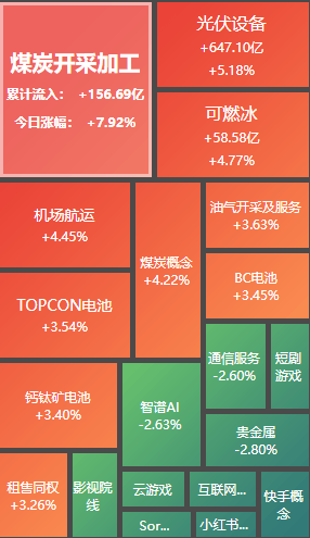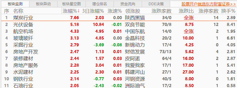 板块方面:涨多跌少,煤炭行业、光伏设备、航空机场、玻璃玻纤、采掘行业、房地产开发板块涨幅居前,贵金属、文化传媒、游戏、互联网服务、半导体板块跌幅居前。