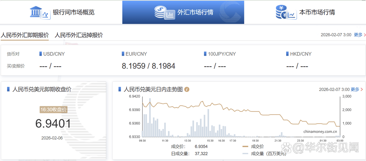 在岸人民币兑美元(CNY)北京时间03:00收报6.9354元,较周四夜盘收盘涨9点。成交量373.22亿美元。