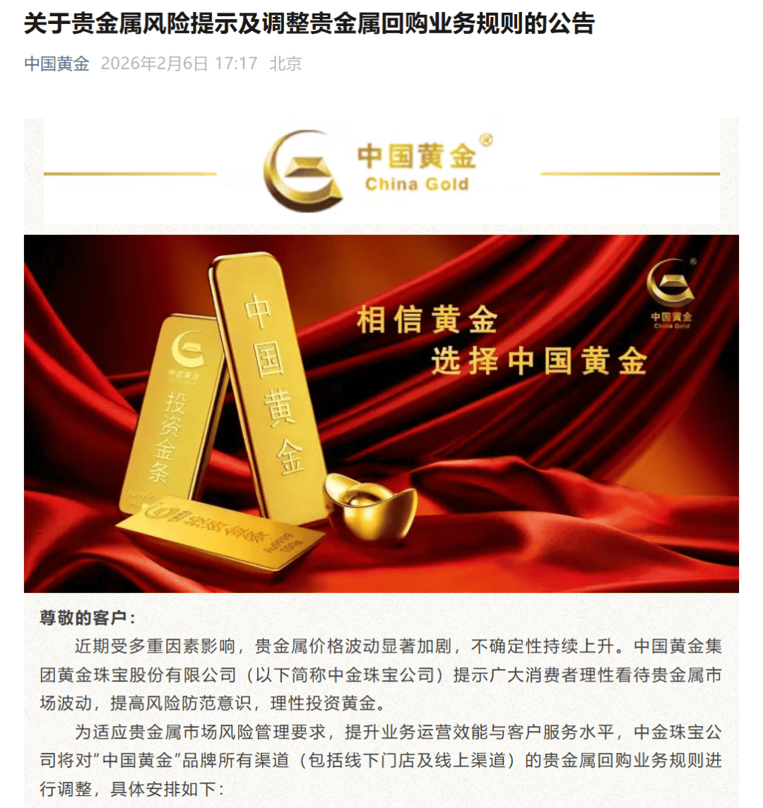 2月6日,“中国黄金”官微发布《关于贵金属风险提示及调整贵金属回购业务规则的公告》(以下简称《公告》)。