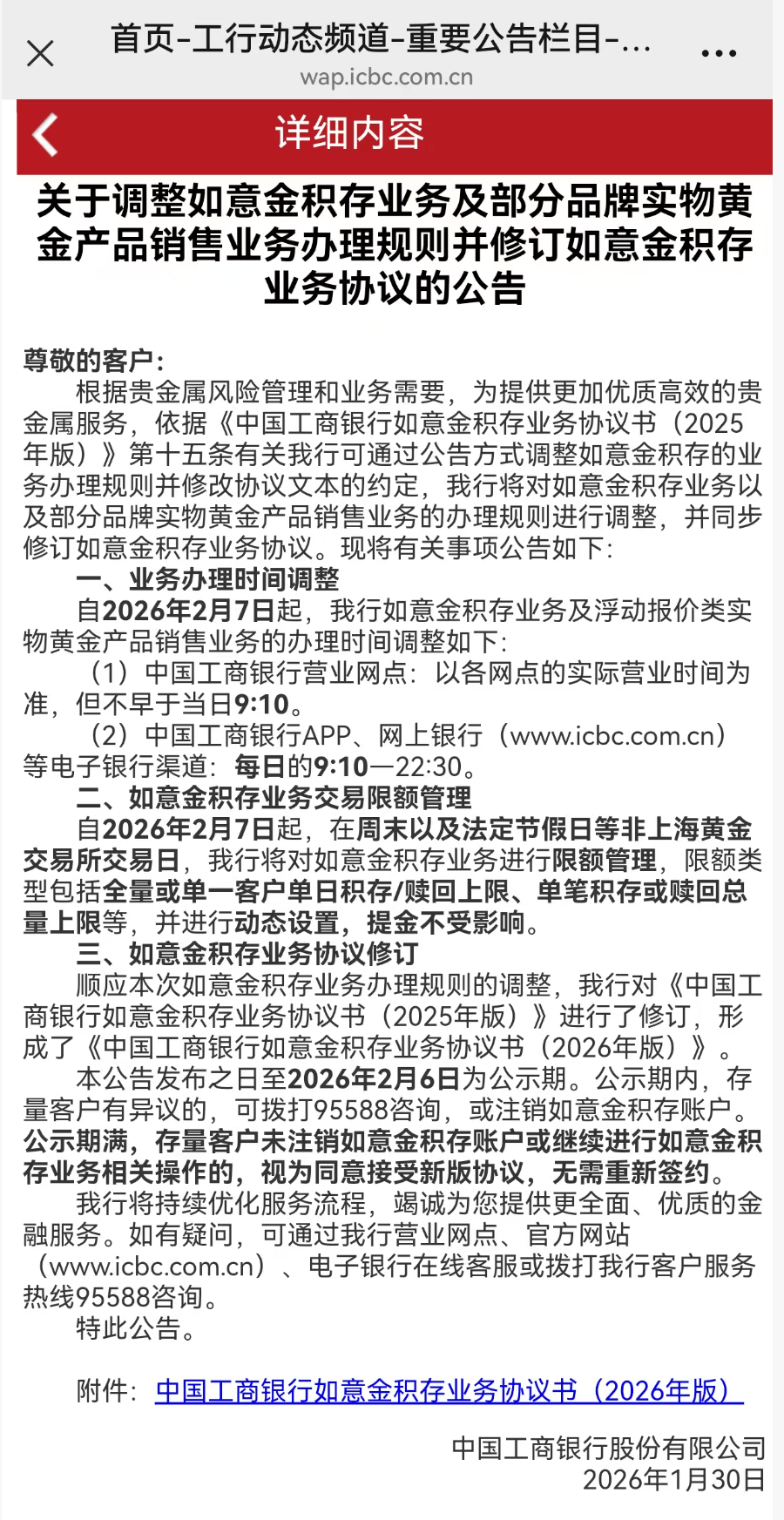 此外,近期国有大行对积存金业务也进行了相应调整。1月30日,工商银行公告称,自2月7日起,在周末以及法定节假日等非上海黄金交易所交易日,该行将对如意金积存业务进行限额管理,限额类型包括全量或单一客户单日积存/赎回上限、单笔积存或赎回总量上限等,并进行动态设置,提金不受影响。