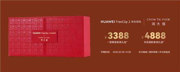 站长之家(ChinaZ.com)2月6日 消息:今日上午10:08,华为与周大福携手打造的FreeClip2套装礼盒正式开售。此次合作共推出“一發暴富”与“凤笙潮韵”两款礼盒,售价分别为3388元和4888元,为消费者带来兼具科技与时尚的独特选择。