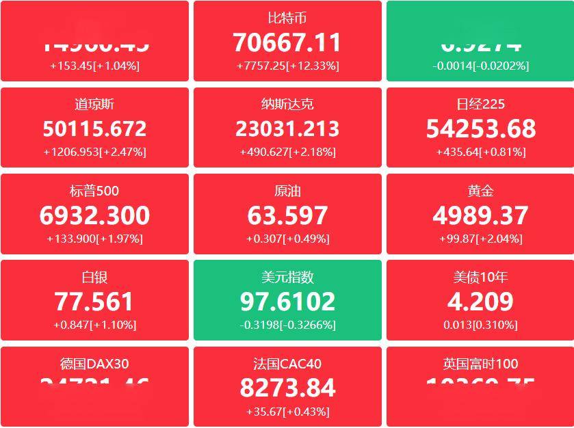 美股全线反弹,截至收盘,标普500指数涨1.97%,报6932.3点;纳斯达克综合指数涨2.18%,报23031.21点;道琼斯工业平均指数涨2.47%,报50115.67点。