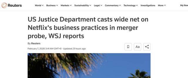 【环球网科技综合报道】2月8日消息,据路透社报道,流媒体巨头Netflix计划以827亿美元收购华纳兄弟探索的交易,目前尚未最终敲定,却已遭到美国司法部的调查,调查重点直指该项收购是否存在反竞争行为。