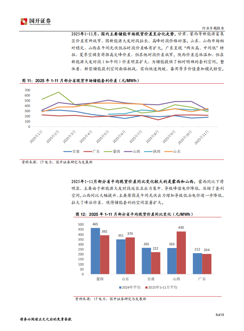 在盈利模式上,独立储能形成了容量价值收益、辅助服务收益、电能量市场收益三类核心模式,构成“基础+稳定+增量”的收益组合。容量收益提供保底保障,辅助服务收益稳定且具备技术溢价,电能量市场收益则依赖峰谷价差套利,潜力与风险并存。2025年1-11月,国内主要储能市场现货价差呈分化走势,甘肃、蒙西等新能源富集区价差收窄,山东、山西市场相对稳定,广东呈现“两头高、中间低”特征,陕西在新能源大发时段价差扩大,为储能套利提供了空间。各地也出台了差异化的容量补偿政策,推动独立储能市场化、规范化发展。
