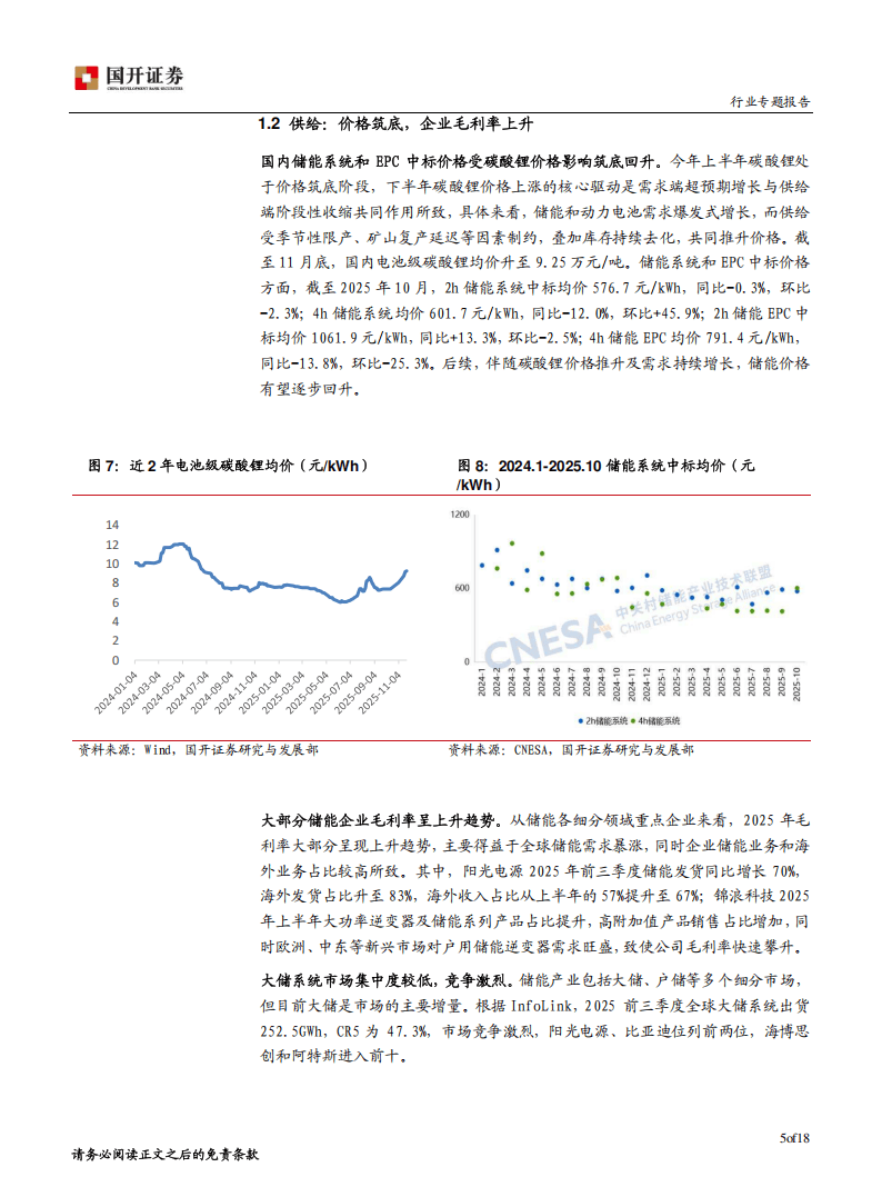 从行业供需来看,2025年1-10月中国新型储能新增装机规模达35.8GW,同比增长36%,预计到2030年,保守场景下累计装机规模将达236.1GW,理想场景超291GW,未来五年复合增速超20%。储能项目呈现大型化和长时化特征,单站规模10万千瓦及以上项目占比62%,储能时长2小时及以上项目占比86%。供给端方面,受碳酸锂价格波动影响,国内储能系统和EPC中标价格筑底回升,截至2025年10月,2h储能系统中标均价576.7元/kWh,4h储能系统均价601.7元/kWh。随着需求增长与成本优化,大部分储能企业毛利率呈上升趋势,行业头部企业凭借技术、资源等优势,市场集中度有望进一步提升。
