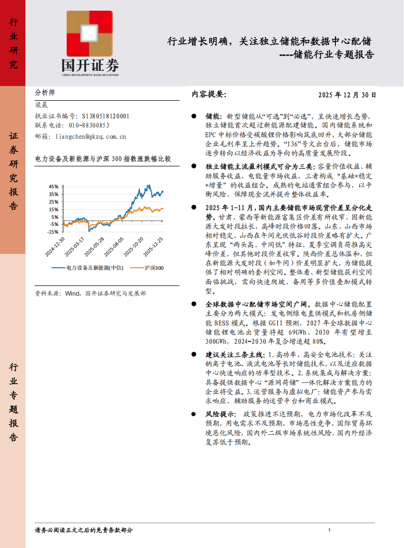 总体而言,在政策引导与市场驱动下,储能行业正迈向高质量发展阶段,独立储能与数据中心配储两大领域齐头并进,技术迭代与商业模式创新持续推动行业升级,为新型电力系统建设提供重要支撑。