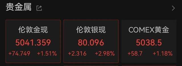 在经历上周的巨震后,北京时间2月9日,现货黄金盘初持续走高,重新站上5000美元/盎司;现货白银则突破80美元/盎司。截至北京时间9时,现货黄金报5041美元/盎司,日内涨超1.5%;现货白银报80美元/盎司,日内涨超2.9%。