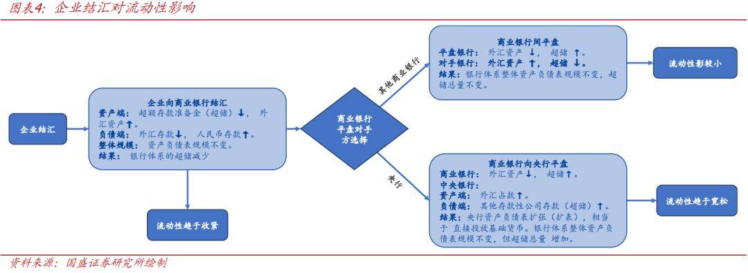 >企业结汇时,外汇资产转换为人民币存款,将引起超储减少、流动性边际收紧。对商业银行资产负债表而言,伴随结汇发生,负债端外汇存款转换为人民币存款,资产端超额存款准备金减少、外汇资产增加。整体资产负债表规模不变,但超储减少、银行间市场流动性边际收紧。