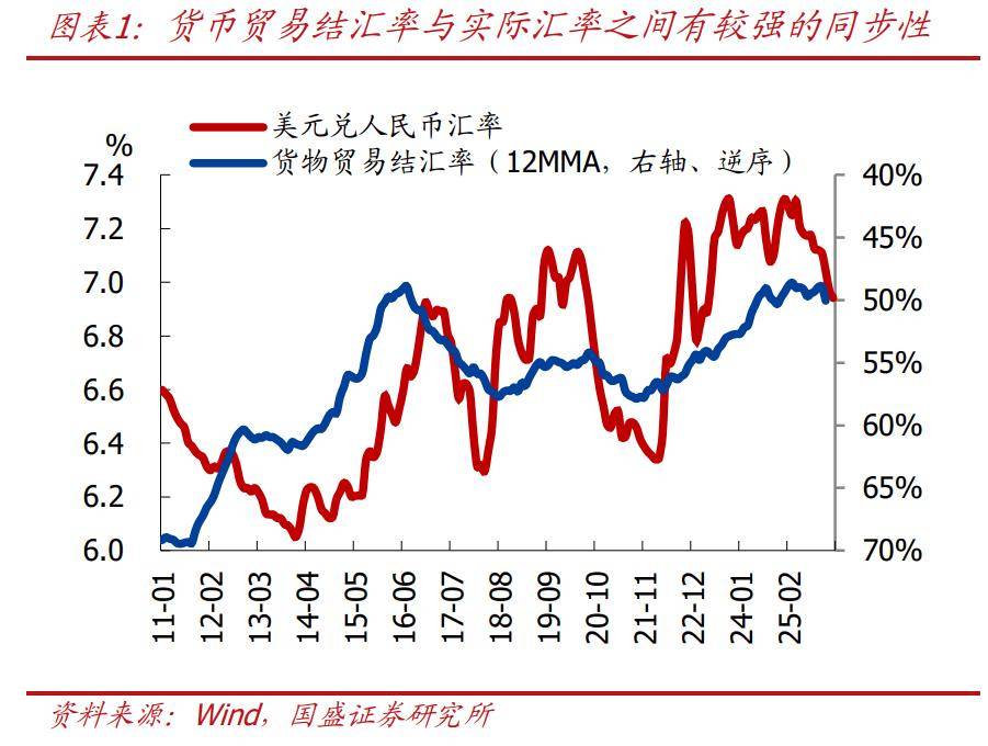 >待结汇资金规模的变化,主要与利差、汇率预期等有关。当中美利差收窄、甚至倒挂时,外币存款/理财产品收益相对占优,企业持汇意愿上升,较为典型的是2022年以来中美利差持续收窄、直至倒挂,货物贸易结汇率从彼时的60%附近降至当前的50%左右;当人民币升值预期较强,企业倾向于结汇,反之则倾向“囤汇不结”,从数据上也可以看到,货物贸易结汇率与实际汇率之间有较强的同步性。