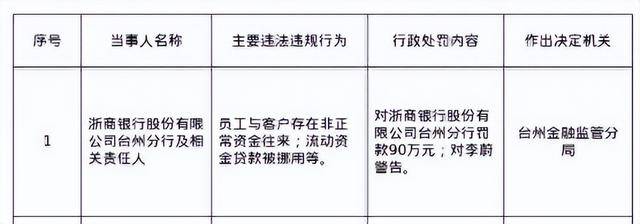 罚单显示,浙商银行股份有限公司台州分行的主要违法违规事实(案由)为:员工与客户存在非正常资金往来;流动资金贷款被挪用等。
