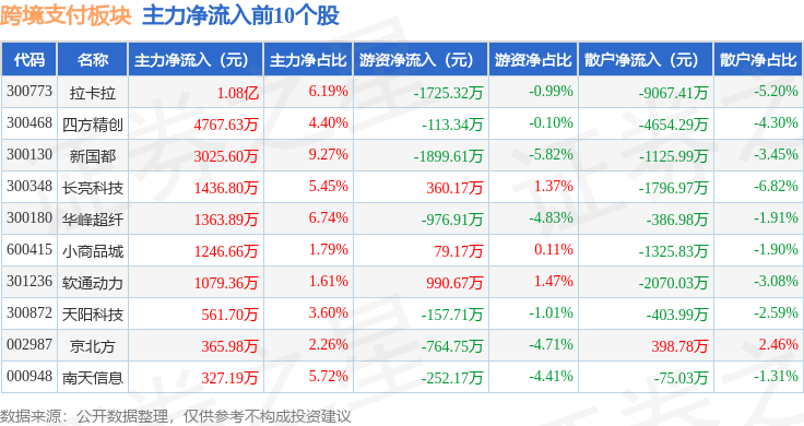 从资金流向上来看,当日跨境支付板块主力资金净流出7.07亿元,游资资金净流出5396.25万元,散户资金净流入7.61亿元。跨境支付板块个股资金流向见下表:
