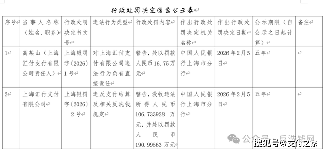 具体来看,上海汇付支付有限公司被给予警告,没收违法所得人民币106.733928万元,并处以罚款人民币190.99563万元;同时,作为公司责任人,高某山因对相关违法行为负有直接责任,被给予警告并处以罚款人民币16.75万元。上述处罚决定作出日期为2026年2月5日,公示期限为五年。