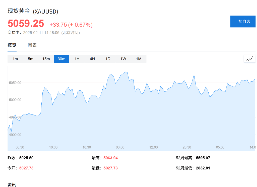 黄金温和上涨,在5000美元上方巩固涨势,此前美国疲软的零售销售数据支持了美联储降息的理由。现货黄金上涨0.6%至每盎司5059.53美元。