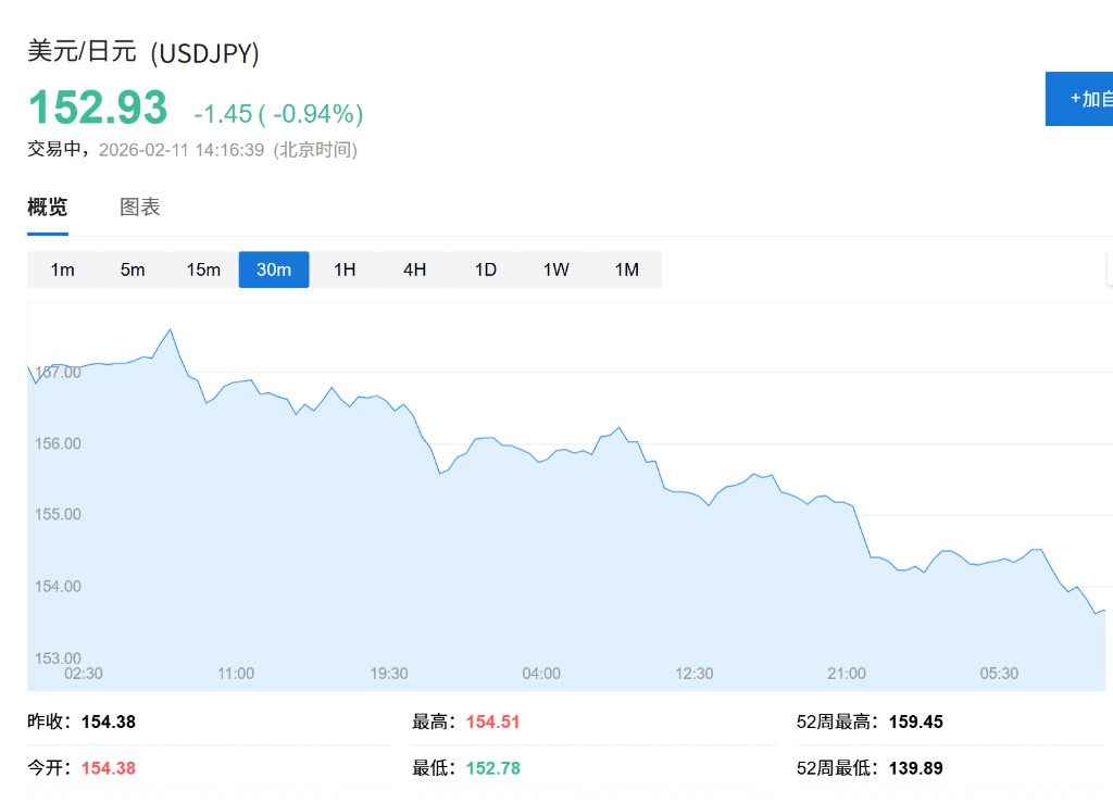 - 美元兑日元跌破153,日内跌幅扩大至1%,现报152.85。