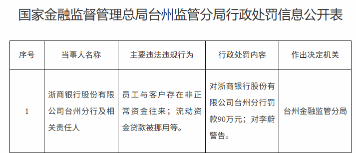 【大河财立方消息】2月11日,国家金融监督管理总局台州监管分局披露的行政处罚信息公开表显示,因员工与客户存在非正常资金往来、流动资金贷款被挪用等,浙商银行股份有限公司台州分行被罚款90万元。