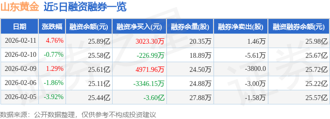 山东黄金融资融券信息显示,融资方面,当日融资买入3.13亿元,融资偿还2.83亿元,融资净买入3023.3万元。融券方面,融券卖出2.05万股,融券偿还5900.0股,融券余量20.35万股,融券余额963.44万元。融资融券余额25.98亿元。