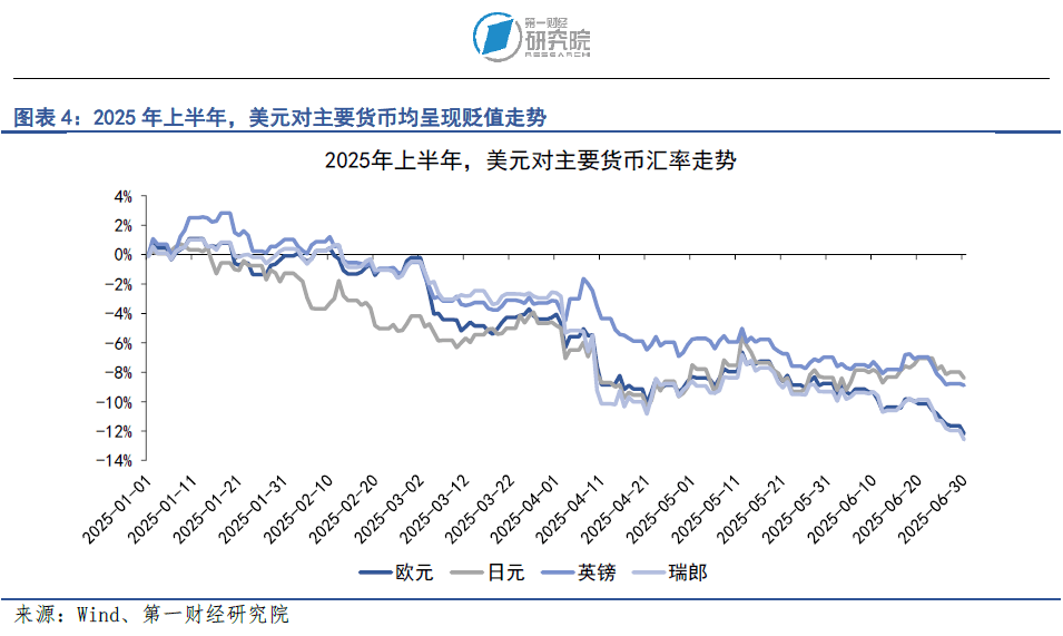 综合来看,2025年,美元指数的强势走势在美国关税政策和财政政策的共同作用下被打破,美元指数从100点位上方回落。在2025年前6个月,美元指数的累计跌幅接近10%,美元对欧元贬值12.2%,对日元贬值8.4%,对英镑贬值8.9%,对瑞士法郎贬值12.6%。