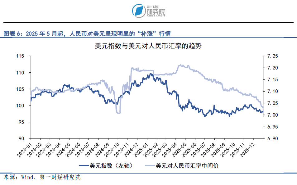 2025年,人民币对美元汇率出现明显的“补涨”行情。从时间顺序上看,美元指数在2025年上半年已经出现显著回落,但人民币对美元汇率在这一阶段并未同步升值,直到5月之后才开始出现较为明确的修复性上涨。因此, 2025年人民币对美元汇率可以分为两个主要阶段:一是在1月至4月期间,人民币对美元整体呈现稳中偏弱的走势,人民币对美元中间价的均值约为7.18,人民币对美元即期汇率的均值约为7.29。二是自5月起,人民币对美元汇率呈现单边上涨趋势,人民币对美元中间价均值由7.19上升至7.06,升幅约为2%,人民币对美元即期汇率均值由7.2上升至7.04,升幅约为2.35%。