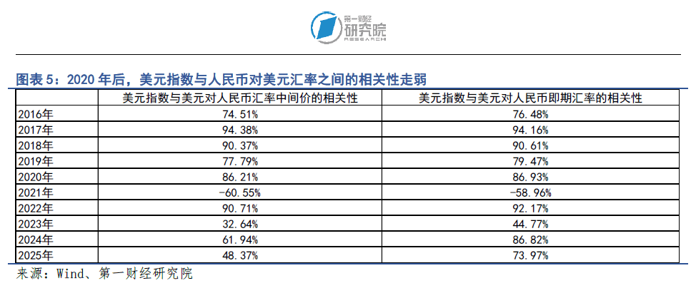 2025年5月至年底,人民币对美元呈现单边升值趋势。其中,人民币对美元中间价汇率升值2.04%,人民币对美元即期汇率升值3.69%。同一时期,美元指数的走势相对平稳,在97至100区间震荡,美元指数与人民币对美元汇率之间的相关性回升,由2025年5月的53.5%上升至12月的74%。