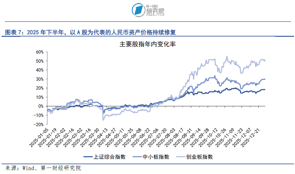 政策效果在资产价格层面显现,人民币资产价格修复与人民币汇率提升形成共振。2025年下半年,A股市场风险偏好明显回升,指数与成交量同步改善,部分此前长期被低估的板块迎来估值修复。2025年全年,A股上证综指、中小板指数和创业板指数分别上涨18.4%、29.5%和49.6%。