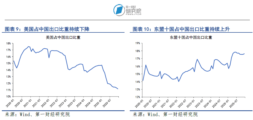 从出口国别来看,美国占中国出口的比重持续下降,而拉丁美洲、东盟十国和非洲占中国出口的比重持续上升。2025年,在贸易战的影响下,美国占中国出口比重由14.7%下降至3.5%,降幅达到11.2个百分点。与此同时,中国企业积极开拓新市场或新渠道绕道北美市场,其中东盟十国在2025年占我国出口比重上升1.2个百分点,非洲占我国出口比重上升1个百分点,中国香港占出口比重上升0.8个百分点,而欧洲、大洋洲国家占我国出口比重基本保持稳定。