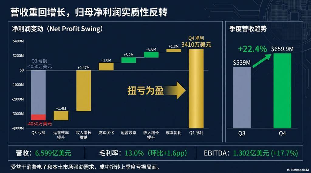 根据财报数据,华虹半导体第四季度销售收入达到6.599亿美元,环比大幅增长22.4%,这一表现位于公司此前业绩指引区间的高端。当季毛利率提升至13.0%,归母净利润录得3410万美元,相比上一季度4050万美元的亏损,实现了实质性的业绩反转。