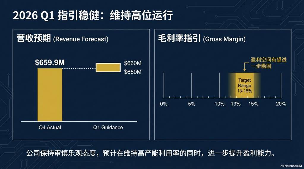 产能利用率的超负荷运转成为本次财报的核心亮点。公司第四季度整体产能利用率攀升至103.8%,其中8英寸和12英寸产线均维持满载状态。展望2026年第一季度,公司给出了稳健的业绩指引,预计销售收入将在6.5亿美元至6.6亿美元之间,毛利率预计维持在13%至15%区间,显示出业务复苏态势的延续。