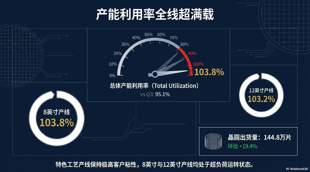更为关键的是,公司的产能利用率达到了超饱和状态。数据显示,第四季度总体产能利用率为103.8%,较上一季度的95.1%和去年同期的96.1%均有显著提升。细分来看,8英寸晶圆厂的产能利用率为103.8%,12英寸晶圆厂的产能利用率也达到了103.2%。这一数据表明,公司的特色工艺产线在当前市场环境下依然保持着极高的客户粘性与订单需求。