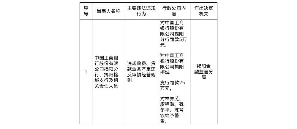 针对上述违法违规行为,国家金融监督管理总局揭阳监管分局对中国工商银行股份有限公司揭阳分行罚款5万元;对中国工商银行股份有限公司揭阳榕城支行罚款25万元;对林界芜、廖锦瀚、魏尔平、陈育钦给予警告。