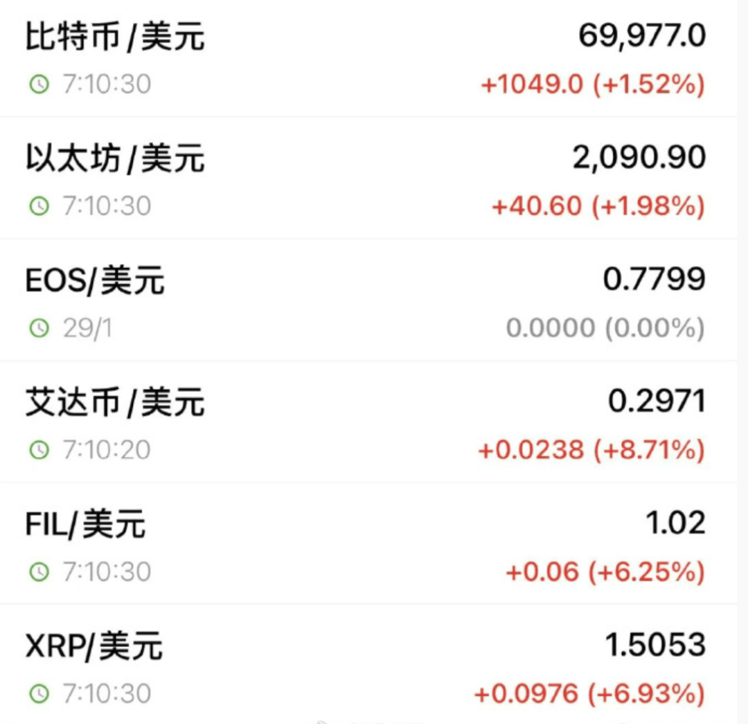 比特币价格一度站上70000美元,截至发稿涨幅收窄报69977美元/枚;以太坊涨近2%,现报2090.9美元;狗狗币涨近10%。