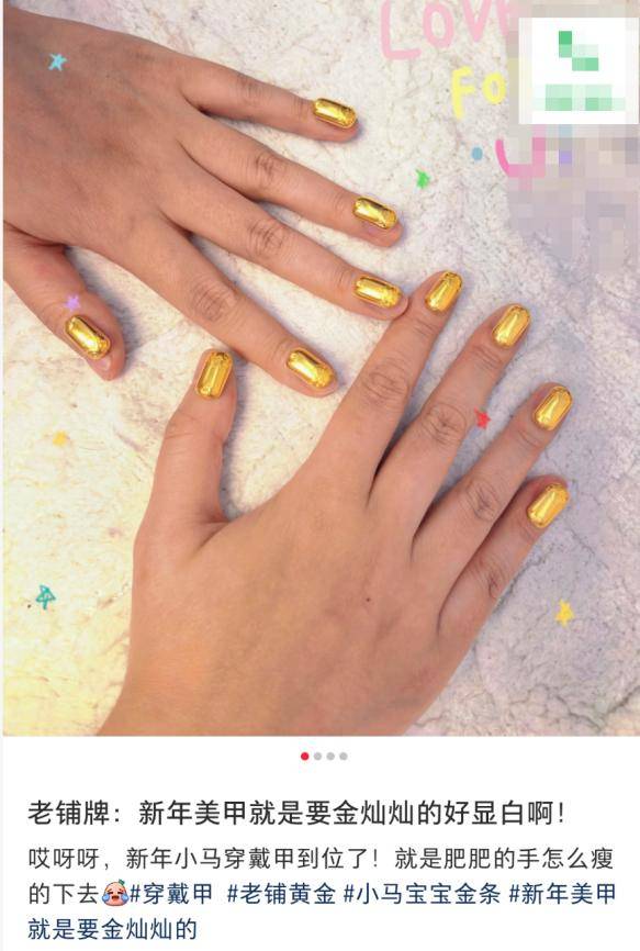 六福珠宝、周六福等品牌店铺的店员,也将金饰用于美甲“宣传”,在社交媒体进行营销。