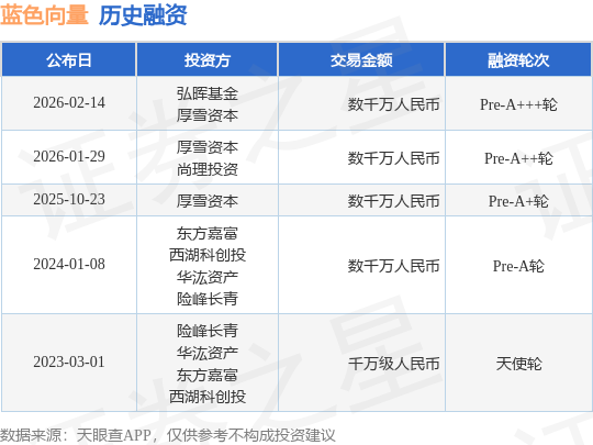 证券之星消息,根据天眼查APP于2月14日公布的信息整理,蓝色向量智能科技(杭州)有限公司Pre-A+++轮融资,融资额数千万人民币,参与投资的机构包括弘晖基金,厚雪资本。