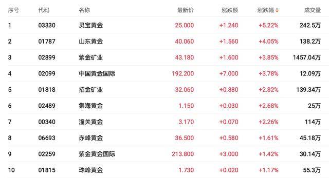 财联社2月16日讯(编辑 胡家荣)今日港股黄金板块表现活跃,多只标的涨幅显著。截至发稿,灵宝黄金(03330.HK)涨5.22%、山东黄金(01787.HK)涨4.05%、紫金矿业(02899.HK)涨3.85%、中国黄金国际(02099.HK)涨3.78%。