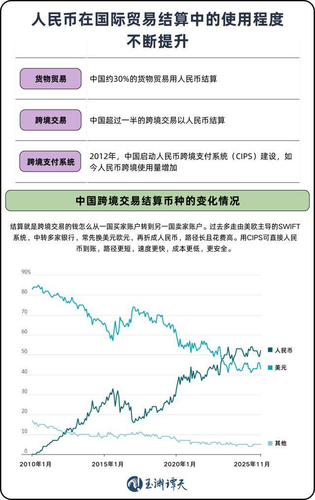 一部分人民币结算也正在从欧美主导的SWIFT系统转向中国的人民币跨境支付系统CIPS。