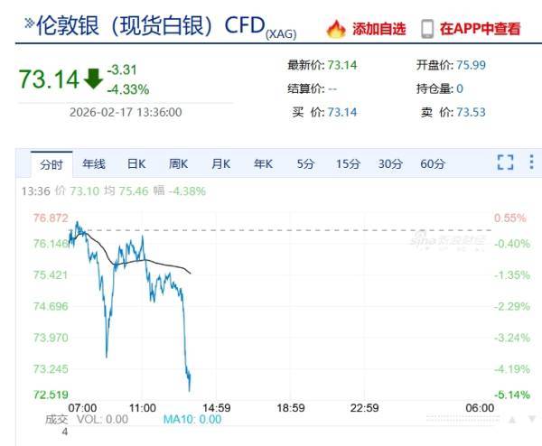 现货白银价格报73.14美元/盎司,下跌4.33%。