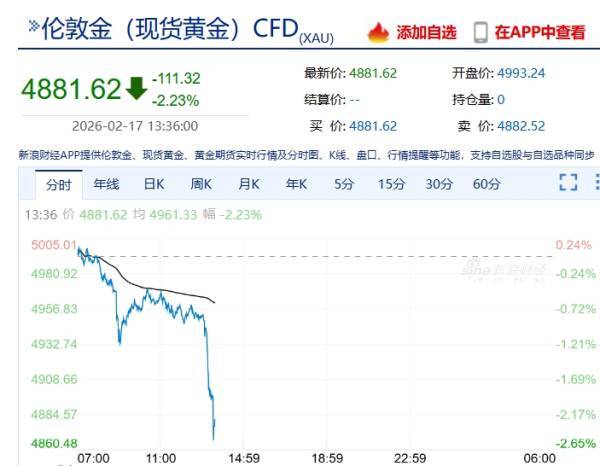 截至下午13时30分,伦敦现货黄金价格报4881.62美元/盎司,下跌2.23%;