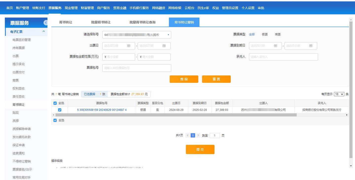 接下来点击 票据服务 - 电子汇票 - 背书转让 - 背书转让撤销,选择账号,票据类型选择“全部”,再点“查询”,只要符合条件可供撤销的新一代票据,都会在列表中显示出来。选择需要撤销的票据,再点“提交”,按提示完成撤销的经办操作。