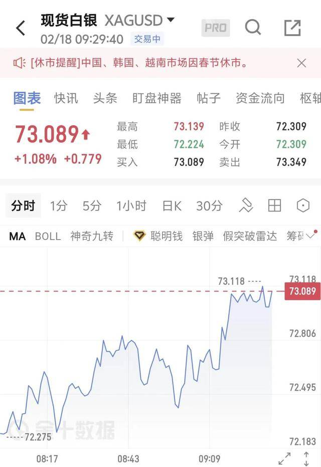 国际贵金属方面,黄金白银低开后强势拉升,现货黄金一度跌近0.5%,随后短线拉升涨超0.2%,逼近4900美元/盎司;现货白银一度跌超1.6%,现报73美元/盎司,日内涨0.78%。