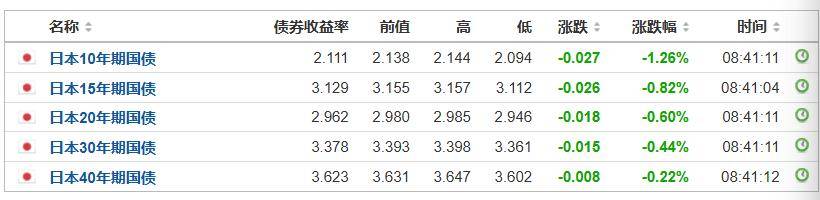 日债收益率全面下跌,日本10年期国债收益率跌至2.111%。30年期日本国债收益率跌至3.378%。