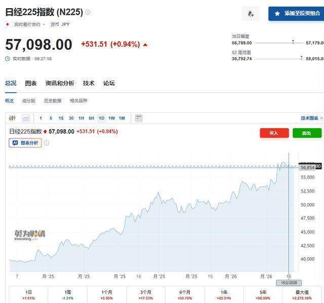 2月18日,日经225指数高开,涨幅一度扩大超1%,截至北京时间9:30左右,报57098点。
