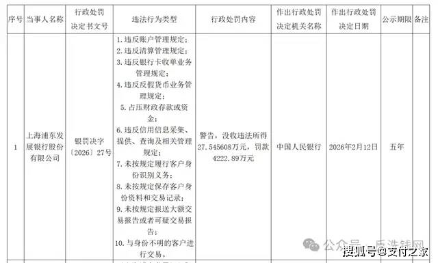 浦发银行则因违反账户管理、清算管理、银行卡收单业务管理、反假货币业务管理、占压财政存款或资金、征信管理以及反洗钱相关规定,被给予警告,没收违法所得27.545608万元,罚款4222.89万元;按罚没口径合计约4250.435608万元。