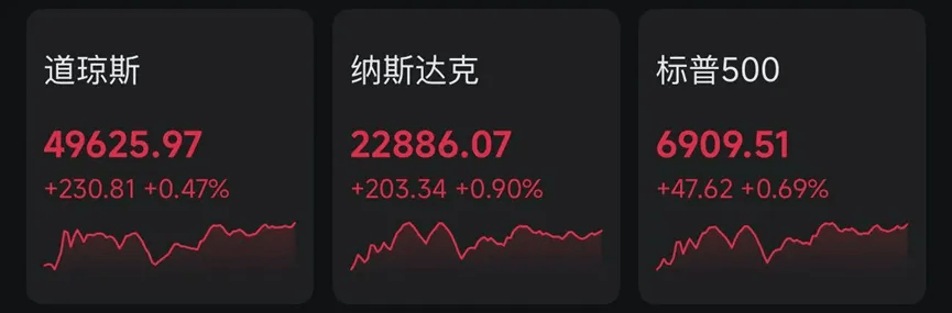 或受经济数据影响,美股当日低开。随着特朗普政府大规模关税被判定违法的消息出炉,美股三大指数反弹并最终收涨。截至收盘,道指涨230.81点,涨幅0.47%,报49625.97点;纳指涨203.34点,涨幅0.90%,报22886.07点;标普500指数涨47.62点,涨幅0.69%,报6909.51点。
