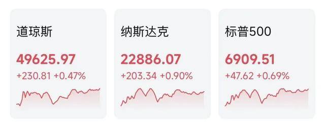 截至收盘,道琼斯工业平均指数上涨0.47%,报49625.97点;纳斯达克综合指数上涨0.9%,报22886.07点;标普500指数上涨0.69%,报6909.51点。