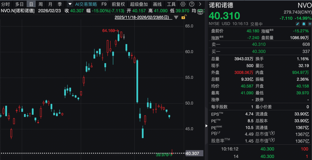 减肥药巨头诺和诺德盘中跌近15%。消息面上,该公司宣布其新一代减重药物未能达到关键目标—— 证明其效果不劣于礼来的竞品。诺和诺德在周一早间声明中表示,在84周治疗后,其药物CagriSema未能达成与礼来替尔泊肽(tirzepatide)对比减重效果非劣效的主要终点。