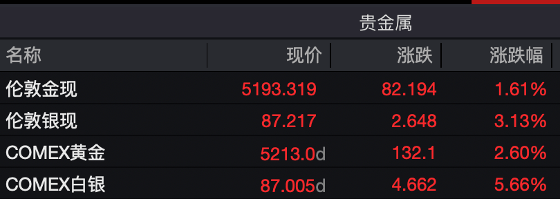 另外,23日晚间,黄金、白银继续飙涨。国际现货黄金、现货白银涨幅分别为1.61%、3.13%。COMEX黄金突破5200美元关口,截至发稿涨幅扩大至2.6%;COMEX白银突破87美元关口,涨幅扩大至5.66%。