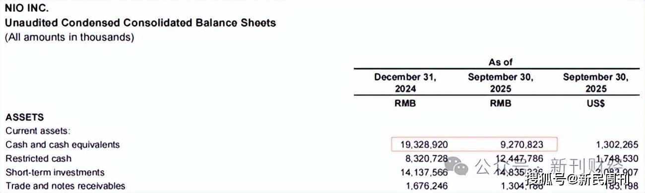 截至2025年三季度末,蔚来的现金储备约为92.71亿元,相比于2025年年初的193.29亿下降过半。