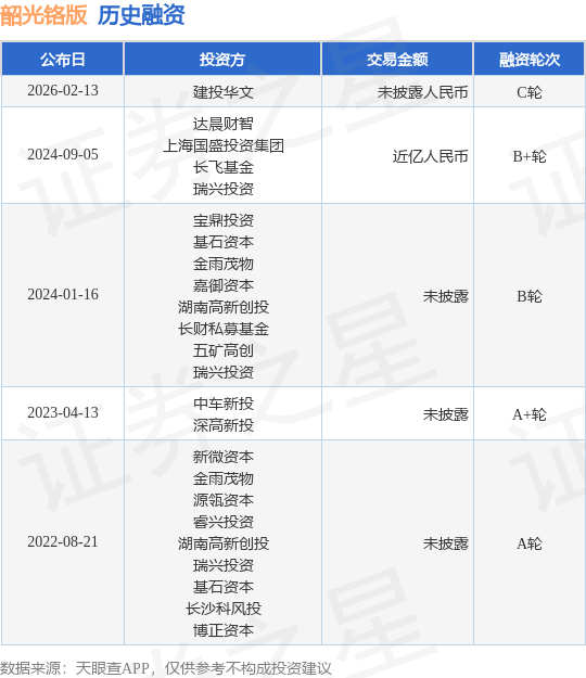证券之星消息,根据天眼查APP于2月13日公布的信息整理,长沙韶光芯材科技有限公司C轮融资,融资额未披露人民币,参与投资的机构包括建投华文。